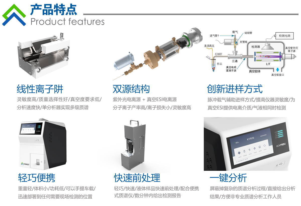 Kyrin2系列小型質(zhì)譜儀以便攜為設(shè)計目標,采用單個離子阱(LIT)質(zhì)量分析器+真空電噴霧離子源(選配紫外光電離源)方案,使用脈沖載氣輔助進樣接口實現(xiàn)耦合,可以配置任何敞開式離子源實現(xiàn)氣相、液相、固相分析。儀器體積小、重量輕,可以徒手搬運部署到應(yīng)用位置。